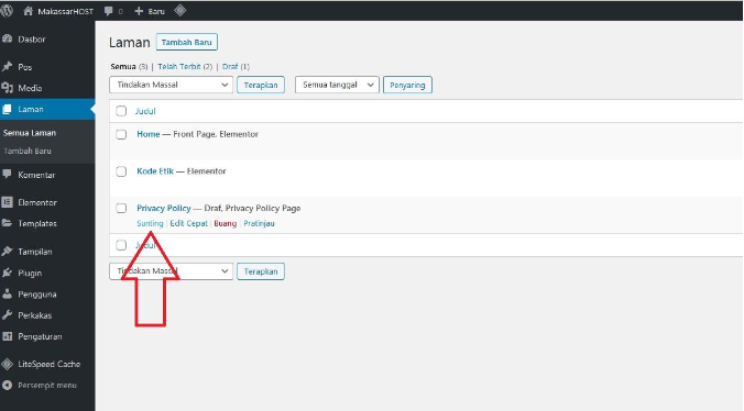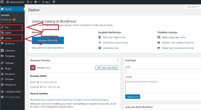 Pilih pada menu ”Pos” atau “Laman” sesuai dengan lokasi halaman website Anda.