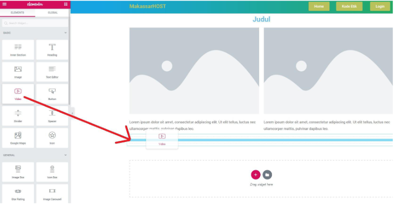Setelah muncul menu-menu tersebut lalu pilih menu video. Tarik dan tahan (drag and drop) menu video tersebut ke lokasi yang diinginkan sampai muncul tanda biru pada bagian tujuan akhir. Lalu lepaskan mouse sehingga menu video otomatis akan muncul pada bagian tersebut.